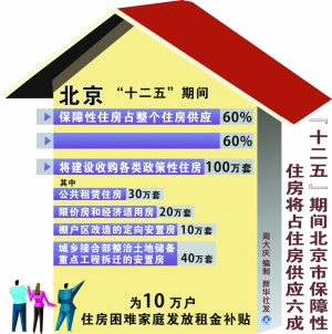 “十二五”期間,本市計劃新建、收購各類保障性住房100萬套,并為10萬戶家庭發放租金補貼。此外,本市保障性住房供應將向“以租為主”轉變,公共性租賃住房將占到公開配租配售保障房數量的60%以上。這是記者從昨日“十一五”北京城市建設成就新聞發布會上了解的。