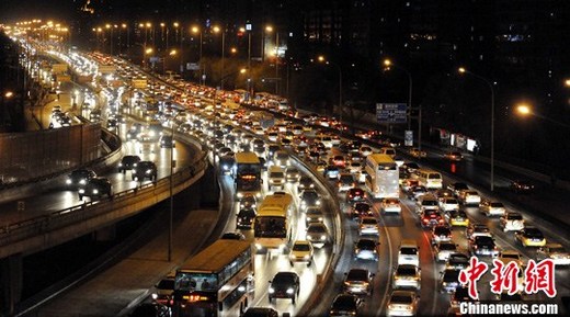 12月14日晚,北京北二環擁堵不堪,車燈形成了一道長虹。12月13日,北京市政府公布了《北京市治理交通擁堵綜合措施》。中新社記者 劉震 攝