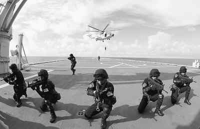 8時(shí)29分,編指下令“徐州”艦展開(kāi)援救行動(dòng)。擔(dān)負(fù)封控掩護(hù)任務(wù)的直升機(jī)呼嘯而起,2艘小艇搭載8名特戰(zhàn)隊(duì)員向“泰安口”輪高速駛?cè)ァ?/P>