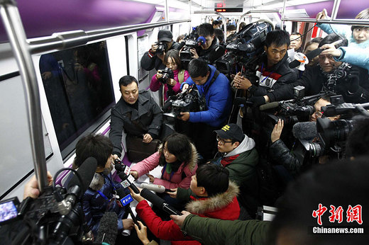 12月30日,北京5條地鐵新線開門迎接乘客。這5條地鐵線路包括房山線、昌平線一期、15號(hào)線一期、亦莊線和大興線,總長度達(dá)108公里。上述地鐵線路全部開通后,北京市軌道交通運(yùn)營里程將首次突破300公里。中新社記者 富田 攝