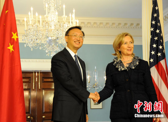 當地時間1月5日,美國國務卿希拉里在美國國務院會晤了中國外交部部長楊潔篪,兩國外長此次會面主要是為中國國家主席胡錦濤即將對美國展開國事訪問進行“預熱”。中新社記者 吳慶才 攝