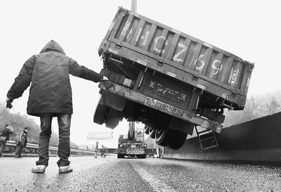 5日,一輛貨車因道路結(jié)冰而失控沖下貴新高速公路。工作人員利用吊車施救。吳東俊攝(人民圖片)