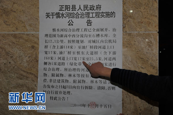 圖為正陽縣政府工作人員指認2010年12月15日發布的《正陽縣人民政府關于慎水河綜合治理實施的公告》(1月5日攝)。連日來,一段名為《居民阻止施工遭碾死 執法者冷眼旁觀》的視頻在網絡上迅速傳播。視頻中反映河南省正陽縣水務局等部門在當地慎水河道施工過程中,當地居民李莉被挖土機碾死,而現場的公安、水利部門工作人員視而不見。該事件經網絡轉發后,引發網友的廣泛關注和熱議。“中國網事”記者前往現場采訪了當地政府有關負責人和居民。新華社記者 單純剛 攝