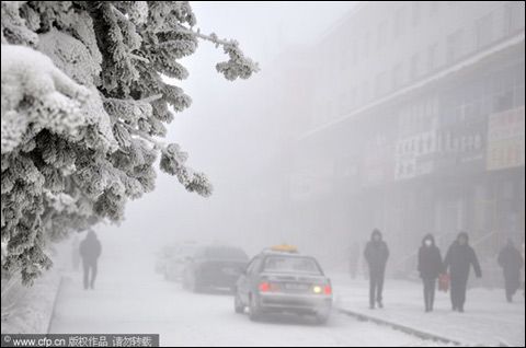 嚴寒低溫導致呼倫貝爾全市出現冰霧,能見度差,地上樹上全是冰,人們出行受到很大影響。在家住牙克石市的許女士看來,似乎整個城市也如同人們感受的寒冷一樣,被“速凍”了!按蠼稚先松倭嗽S多,人們盡可能在晚上不出門。路面上被車尾氣化開的積雪,大都積成厚厚的冰層,人們在冰上行走時,步步都要小心!痹S女士說。這樣的冰霧天氣一直持續到17日才有所好轉。