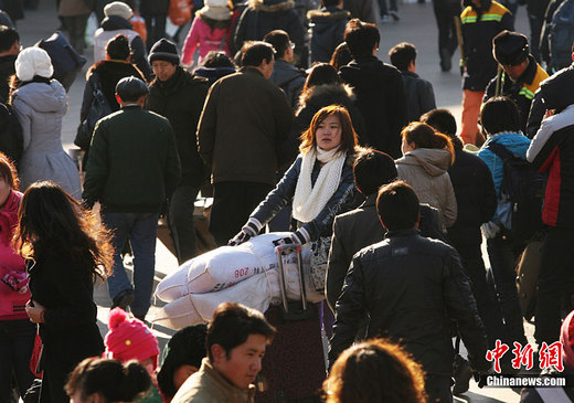 1月17日,旅客在北京站廣場準備進站。中國2011年鐵路春運即將于1月19日開始,至2月27日結束。預計將發送旅客2.3億人次。連日來,北京站旅客發送量呈持續增高趨勢。中新社記者 蘇丹 攝
