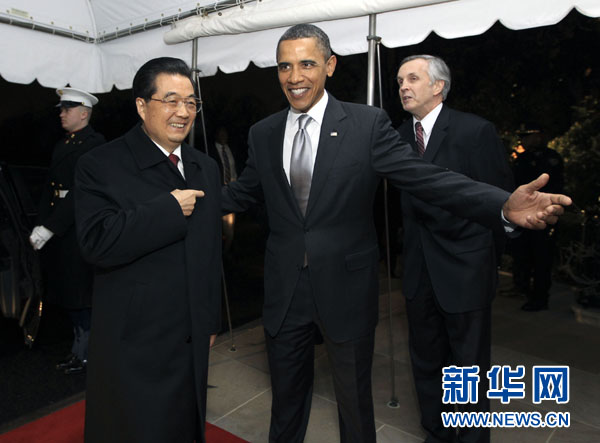 1月18日,國家主席胡錦濤出席美國總統(tǒng)奧巴馬在白宮舉行的私人晚宴。這是胡錦濤主席抵達時,受到奧巴馬總統(tǒng)的熱情迎接。 新華社發(fā)