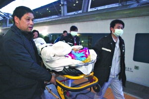 昨日,北京西站工作人員,拆下窗戶玻璃,將患者抬到擔架上。本報記者 韓萌 攝