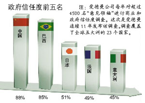 26日,世界五大公關(guān)公司之一的愛德曼發(fā)布了2011年度全球信任度調(diào)查報告。報告顯示,中國政府以88%的信任度排名全球第一。