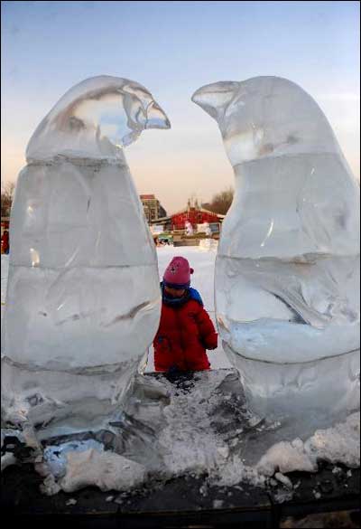 氣溫回升,北京龍潭公園冰雕底座部分已融化