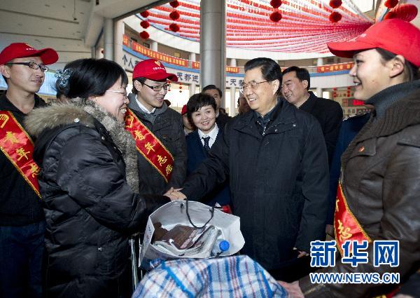 2月1日和2日,農歷臘月二十九和臘月三十,中共中央總書記、國家主席、中央軍委主席胡錦濤在河北省保定市同基層干部群眾共迎新春。這是胡錦濤在保定市長途汽車客運中心站親切看望慰問青年志愿者和候車旅客。新華社記者李學仁攝