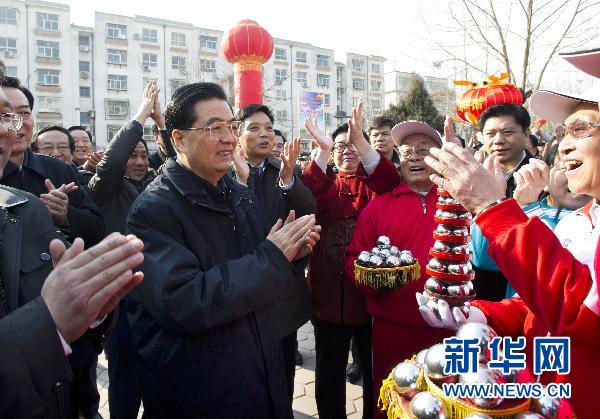 2月1日至3日,農(nóng)歷臘月二十九到正月初一,中共中央總書記、國家主席、中央軍委主席胡錦濤在河北省保定市同干部群眾共度新春佳節(jié)。這是胡錦濤正月初一上午在保定市茗暢園社區(qū)廣場向正在參加節(jié)日活動(dòng)的居民致以新年問候。新華社記者李學(xué)仁攝