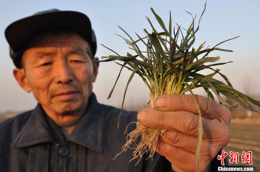 1月24日,山東鄒平縣好生鎮蒙二村村民在查看干旱的麥苗。 董乃德 攝