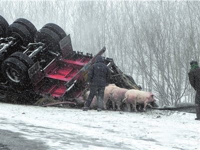 京沈高速玉田段,一輛運豬大貨側(cè)翻。