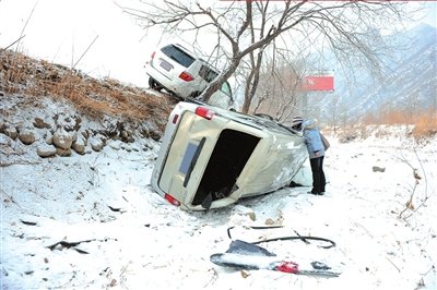 門頭溝忠良書院附近,兩輛車一掛樹一翻溝。本報記者王苡萱攝