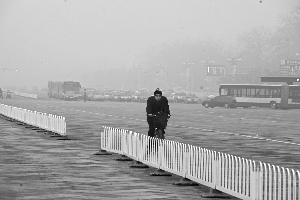 大霧中,一市民騎自行車經過長安街。昨日清晨,北京出現大霧。記者 周曉東 攝