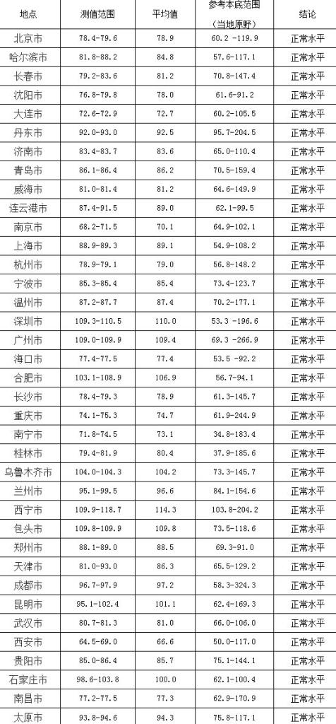 16日公布的“匯總圖”顯示,所有被監(jiān)測(cè)城市的綠色曲線均在藍(lán)色柱體范圍內(nèi)。這意味著中國(guó)輻射環(huán)境水平尚未受到日本核電事故的影響。