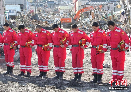 3月18日下午,日本民眾為一周前大地震中6000多名遇難者舉行默哀儀式,所有避難所和救援人員都停止作業,為死難者哀悼。圖為在巖手縣大船渡災區,中國國際救援隊向日本地震遇難者默哀。