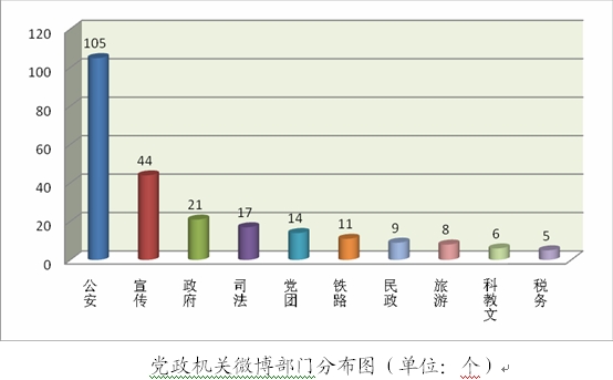 注:公安微博包括公安部門各個機構、警種開設的微博。宣傳微博包括各級黨委宣傳部,政府新聞辦等機構開設的微博。司法微博主要包括司法局、法院、檢察院辦等開設的微博。黨團微博包括各級黨委、團委及所屬部門開設的微博。民政微博包括與民生息息相關的養老、扶貧、救災等機構開設的微博。