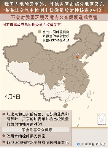 圖表:我國內地除云南外,其他省區市部分地區及東海海域空氣中檢測出極微量放射性核素碘-131不會對我國環境及境內公眾健康造成危害 新華社發