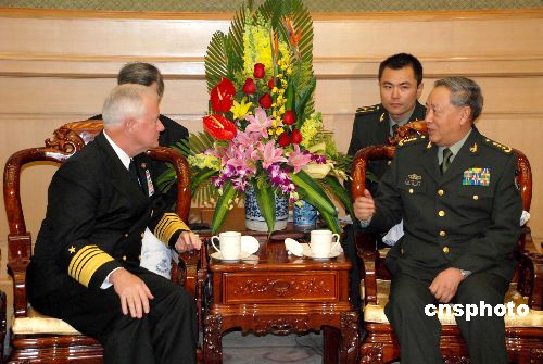 資料圖片:2008年1月14日,中國人民解放軍總參謀長陳炳德上將在八一大樓會見來訪的時任美軍太平洋總部司令蒂莫西·基廷海軍上將一行。 中新社發(fā) 楊鐵虎 攝