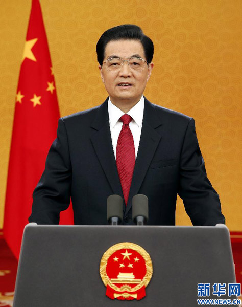 新年鐘聲就要敲響,2013年即將來臨。我很高興通過中國國際廣播電臺、中央人民廣播電臺和中央電視臺,向全國各族人民,向香港特別行政區同胞和澳門特別行政區同胞,向臺灣同胞和海外僑胞,向世界各國和各地區的朋友們,致以新年的祝福!