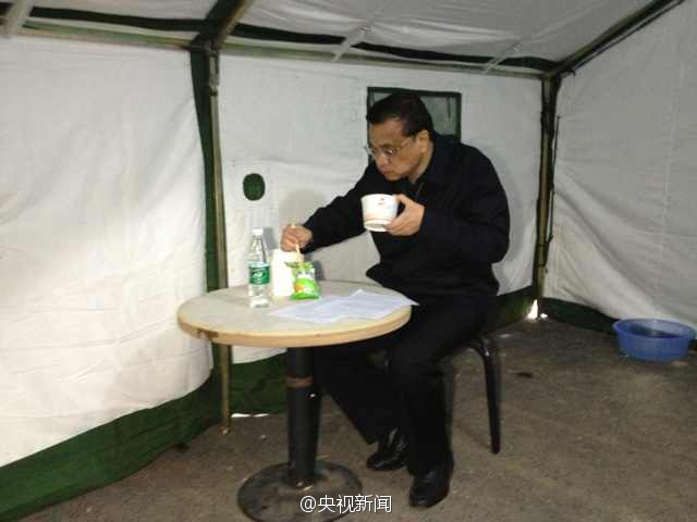 【李克強清晨在帳篷外接受采訪】蘆山的清晨,微涼。不到七點,李克強走出帳篷,面容看起來很憔悴。昨晚的繁忙的工作和凌晨發生的余震令他幾乎沒有休息。他用沙啞的聲音對記者反復強調的仍然是:“現在救人是第一位的!”、“我們要求救援要科學有效!”