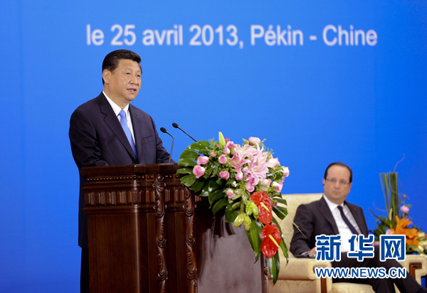 4月25日,國家主席習近平和法國總統奧朗德共同出席在北京人民大會堂舉行的中法商務論壇閉幕式并致辭。(新華社記者 張鐸 攝)
