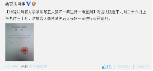 據北京法院網官方微博“京法網事”消息,海淀法院定于9月26日上午9時30分,對被告人李某某等五人強奸一案進行公開宣判。