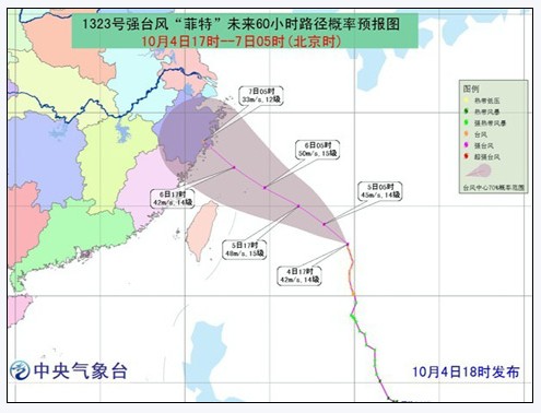 中央氣象臺4日傍晚發布臺風橙色預警,預計今年第23號臺風“菲特”將于5日下午到夜間進入東海東南部海面,并將于6日晚上到7日上午在上述沿海登陸。