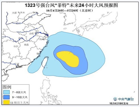 中央氣象臺預報,受“菲特”和冷空氣的共同影響,4日20時至5日20時,臺灣以東洋面、東海大部海域、我國釣魚島附近海域、臺灣海峽、南海東北部、巴士海峽、臺灣沿海、福建沿海、浙江沿海及杭州灣將有7至9級大風。其中臺灣以東洋面和東海東南部的部分海域風力有10至12級,“菲特”中心經過的附近海域的風力有13至15級,臺灣北部將有大到暴雨。