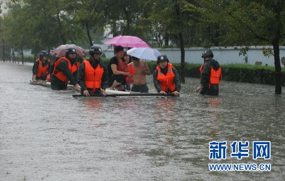 資料圖片:10月7日,在浙江瑞安飛云江北岸街頭,飛云江邊防派出所官兵幫助群眾轉移。 當日凌晨,今年第23號臺風“菲特”在福建省福鼎市沙埕鎮沿海登陸。受其影響,浙江多地出現大到暴雨,部分地區積水嚴重。 新華社發(蔡寬元 攝)