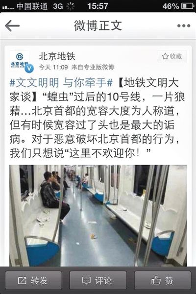 光明網(wǎng)訊(袁晴)昨天,北京地鐵官方微博發(fā)布圖文,稱“‘蝗蟲'過后的10號線,一片狼藉”,并稱“北京有時候?qū)捜葸^了頭”,引發(fā)巨大爭議。盡管這條微博隨后被刪除,但卻被網(wǎng)友截屏并加評論轉(zhuǎn)發(fā)。截至昨日20時,該條微博共有4277條轉(zhuǎn)發(fā),3020條評論。不少網(wǎng)友認為違規(guī)都該被懲罰,但不能歧視。日前,針對這則微博,北京地鐵運營回應稱,該微博為微博部小編所發(fā)文明乘車的宣傳,未料到其表達方式引起爭議。北京地鐵運營表示,目前公司相關(guān)領(lǐng)導已經(jīng)了解情況,待具體處理方案明確后會及時告知媒體。