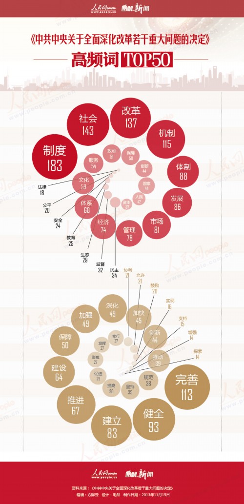 編者按:黨的十八屆三中全會日前審議通過了《中共中央關于全面深化改革若干重大問題的決定》,《決定》今日全文播發。本網梳理《決定》中出現的高頻詞匯,供網友參考。