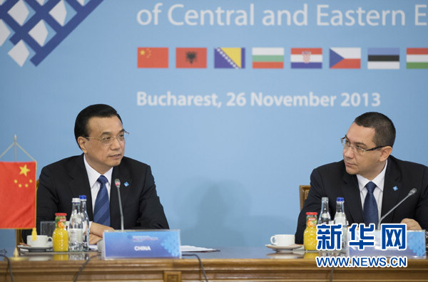 11月26日,中國國務院總理李克強在羅馬尼亞布加勒斯特出席中國-中東歐國家領導人會晤并發表重要講話。右為羅馬尼亞總理蓬塔。新華社記者李學仁攝