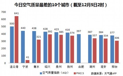 中央氣象臺監(jiān)測顯示,今天白天到夜間,安徽東部和北部、江蘇、上海、浙江北部等大部地區(qū)有中度霾,其中,江蘇等地的部分地區(qū)有重度霾。截至今日早上2時,連云港的AQI(空氣質(zhì)量指數(shù))“爆表”達(dá)到500,PM2.5高達(dá)641,屬于嚴(yán)重污染,成為74個公布PM2.5數(shù)據(jù)城市中空氣質(zhì)量最差的城市。