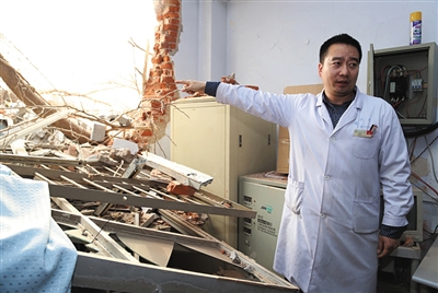 上述兩人對新京報記者介紹,事發(fā)時,放射科同事正在給病人做檢查,突然墻體被挖掘機捅破個大洞,屋內(nèi)設備被砸壞,醫(yī)護人員和病人差點被埋,正在接受檢查的病人嚇得從檢查臺上鞋子都顧不上穿往外逃。距離放射科一兩米的太平間被推毀,6具尸體被埋磚堆下面,至今也沒能抬出來。