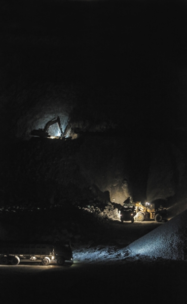 2015年12月27日晚9點,河北省三河市東部礦區,兩側山嶺上燈光閃爍,挖掘機的杵子(鉆頭)一下下鉆進山體,沿路一輛接一輛的大卡車,滿載著石料揚長而去。
