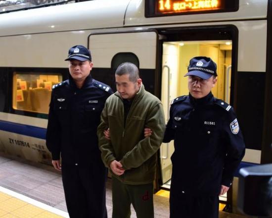 資料圖:2015年11月18日,在漢口火車站,犯罪嫌疑人王某在警方押送下抵達武漢。據武漢警方介紹,嫌疑人王某是“獵狐行動”開展以來,武漢首個自愿從西方國家回國自首的境外逃犯。此前,追逃專班曾先后10次派人登門探望慰問王某父母,解決其生活困難。新華社記者 饒饒 攝