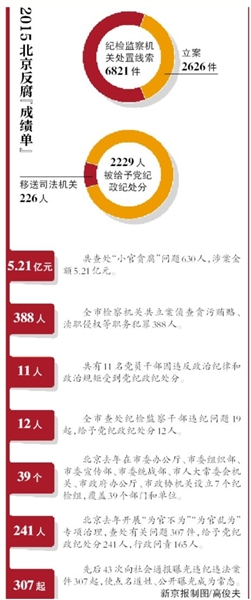 2015年,北京市加大執紀審查力度,全市紀檢監察機關共處置線索6821件,立案2626件,立案數同比增長84.4%;結案2279件;2229人被給予黨紀政紀處分,移送司法機關226人,同比分別增長75.8%、22.2%。
