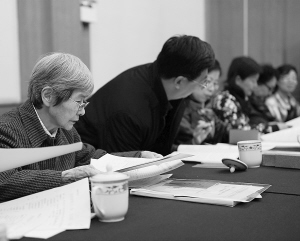 全國政協(xié)委員樊錦詩(左一)仔細(xì)翻閱擬提交提案本報記者 李楊 攝