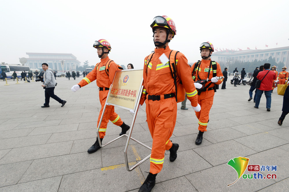 來自天安門地區消防勤務中隊的工作人員進入廣場。人民政協網記者 俞寧攝