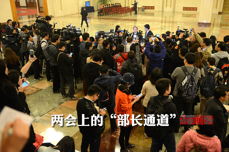 每年兩會,人民大會堂北大廳都是各家媒體派“重兵”把守的“重要關隘”之一。因為按照慣例,在人民大會堂北大廳,有一段長約百米鋪就紅毯的路,國務院各部委主要負責人進出會場經常由此通過,媒體報道時習慣性地稱之為“部長通道”。圖為3月3日,全國政協十二屆四次會議在北京人民大會堂開幕,“部長通道”記者云集。 中新社記者 王東明 攝