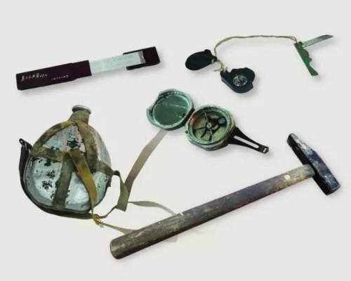 在野外工作時用過的地質錘、羅盤、放大鏡、小刀、計算尺、水壺。圖據地質出版社