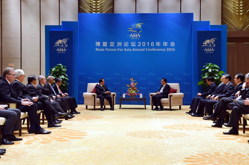 國務(wù)院總理李克強(qiáng)在海南博鰲會見博鰲亞洲論壇理事長福田康夫和理事會部分成員。