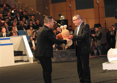 2015年12月3日,浙江溫州電視問(wèn)政現(xiàn)場(chǎng),市民代表送給官員一只蝸牛玩偶,希望該區(qū)“蝸牛工程”能夠加快進(jìn)度。