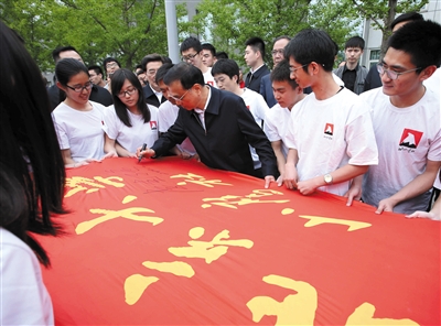 昨日,在考察北京大學時,李克強在北大山鷹社社旗上簽名。