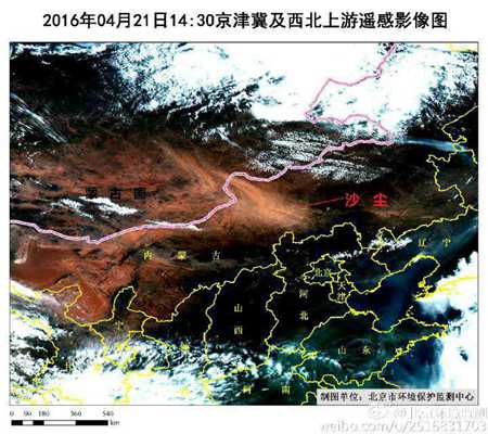 21日下午2點半,京津冀及西北上游遙感影像圖顯示,又一波沙塵來襲,沙塵前鋒已接近河北北部地區。