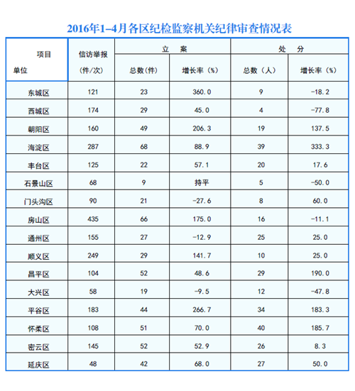 人民網(wǎng)北京5月13日電 據(jù)中央紀(jì)委監(jiān)察部網(wǎng)站消息,2016年1月至4月,北京市各級(jí)紀(jì)檢監(jiān)察機(jī)關(guān)共接受信訪舉報(bào)5407件(次),立案815件,增長59.5%。給予黨紀(jì)政紀(jì)處分532人,增長52%,其中局級(jí)1人,縣處級(jí)138人,鄉(xiāng)科級(jí)122人。移送司法25人。查處違反中央八項(xiàng)規(guī)定精神和市委實(shí)施意見123人,“小官貪腐”104人。