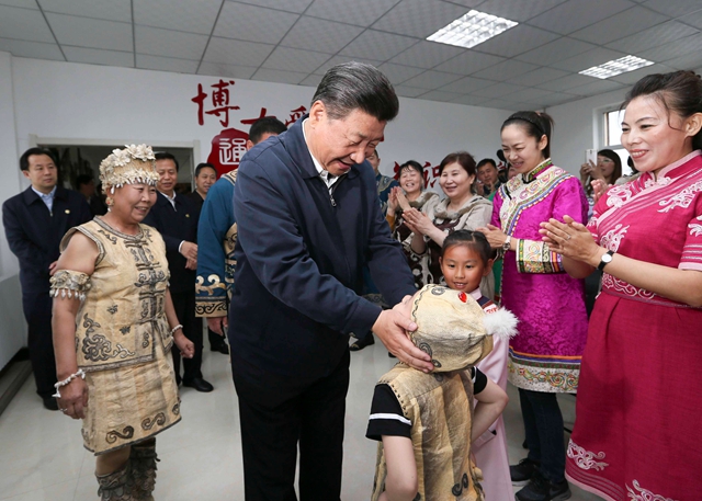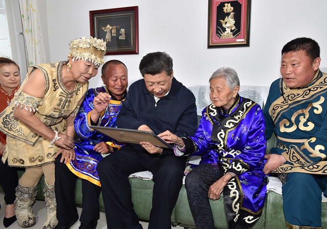 24日下午,習近平總書記來到黑龍江同江市八岔村,看望赫哲族群眾。赫哲族是我國人口較少民族之一,全國有5300多人。在村文化活動中心,習近平饒有興趣地參觀了赫哲族民俗展。一些村民身著民族服裝,正在學習赫哲族特有的伊瑪堪說唱藝術。大家簇擁到總書記身邊,唱了一曲又一曲。習近平邊聽邊拍手打起節拍。一位5歲的小朋友用稚嫩童聲為總書記唱了一首赫哲族歌謠。