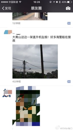 國家海洋局東海分局7日晚通報,當日,中國海監一架直升機在執行飛行任務返航途中失聯。傍晚,搜尋人員在舟山朱家尖大青山山頂發現飛機殘骸,四位機組人員被發現遇難。圖為6月7日,搜救人員前往失事海域搜尋(手機拍攝)。 新華社發 圖片來源:新華網